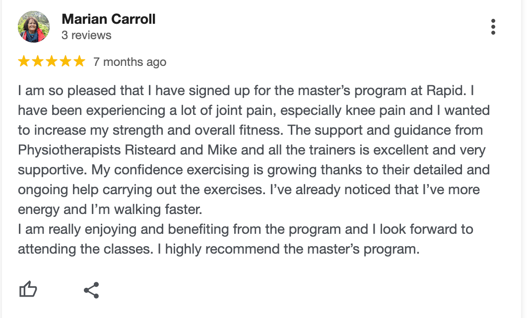 The Masters Program is a physiotherapist-led strength and fitness programme created specifically for adults aged 55 and over.
